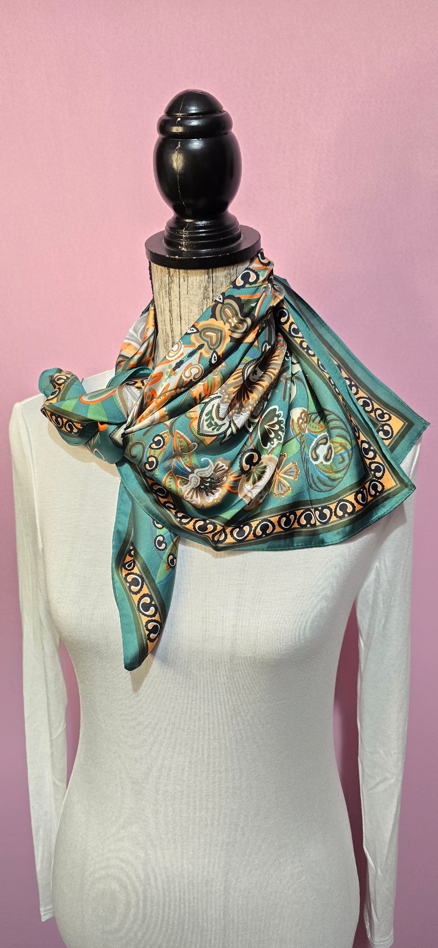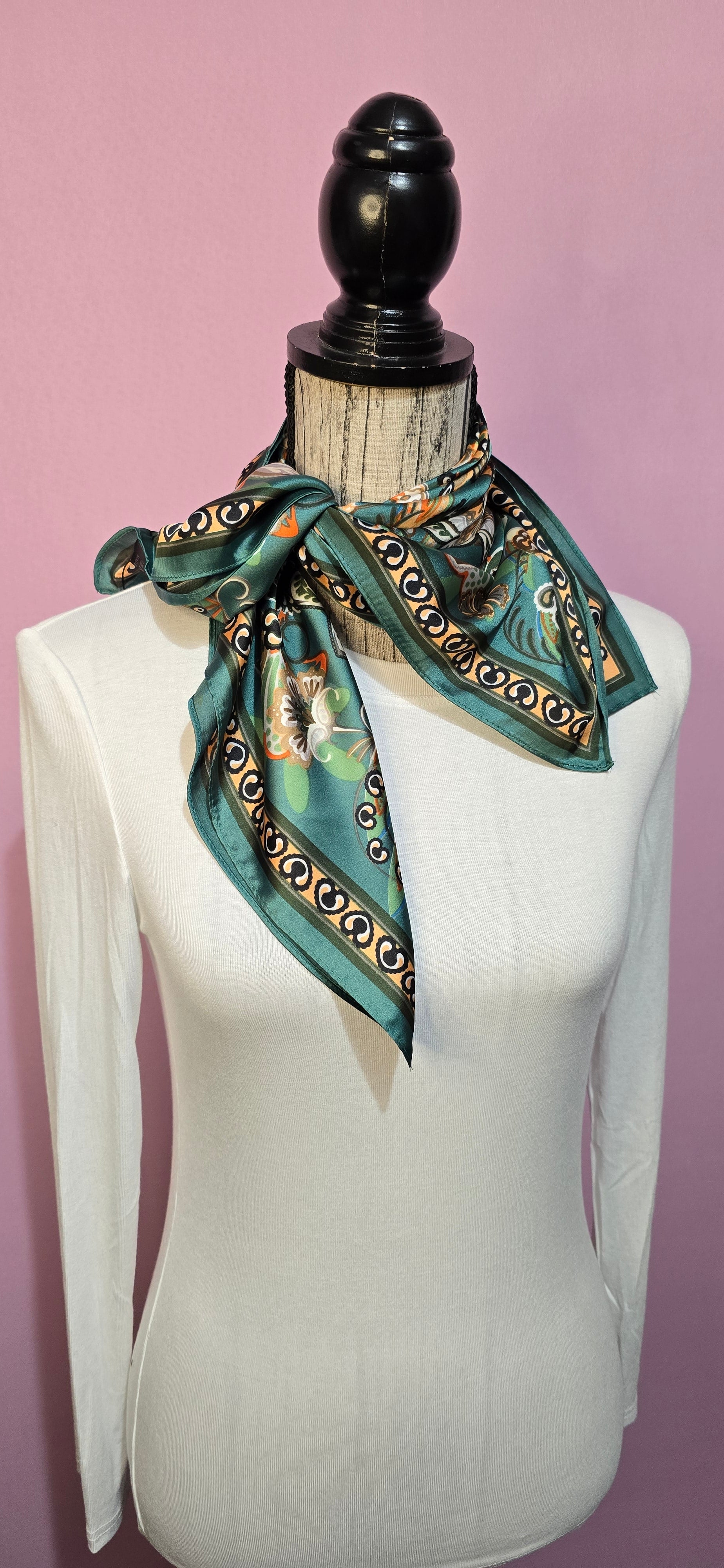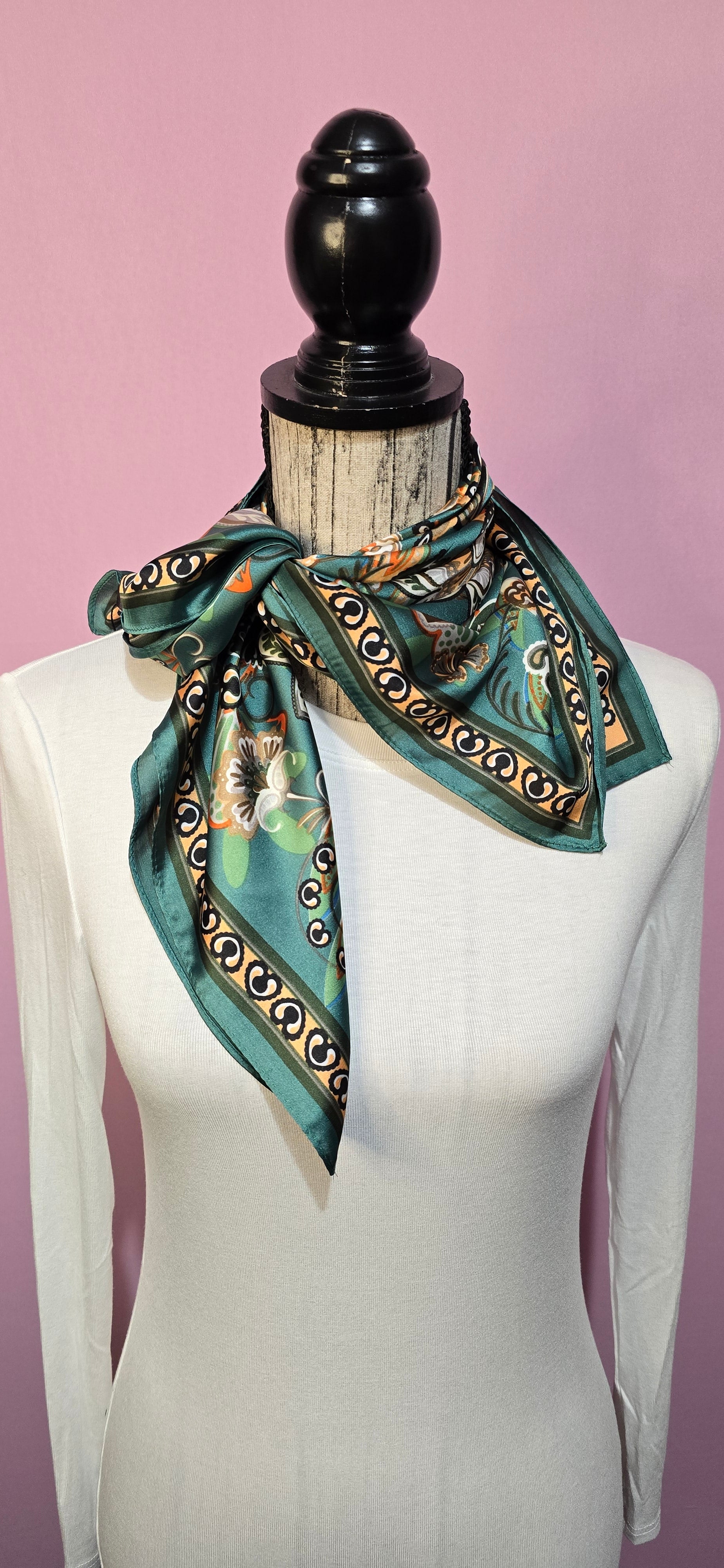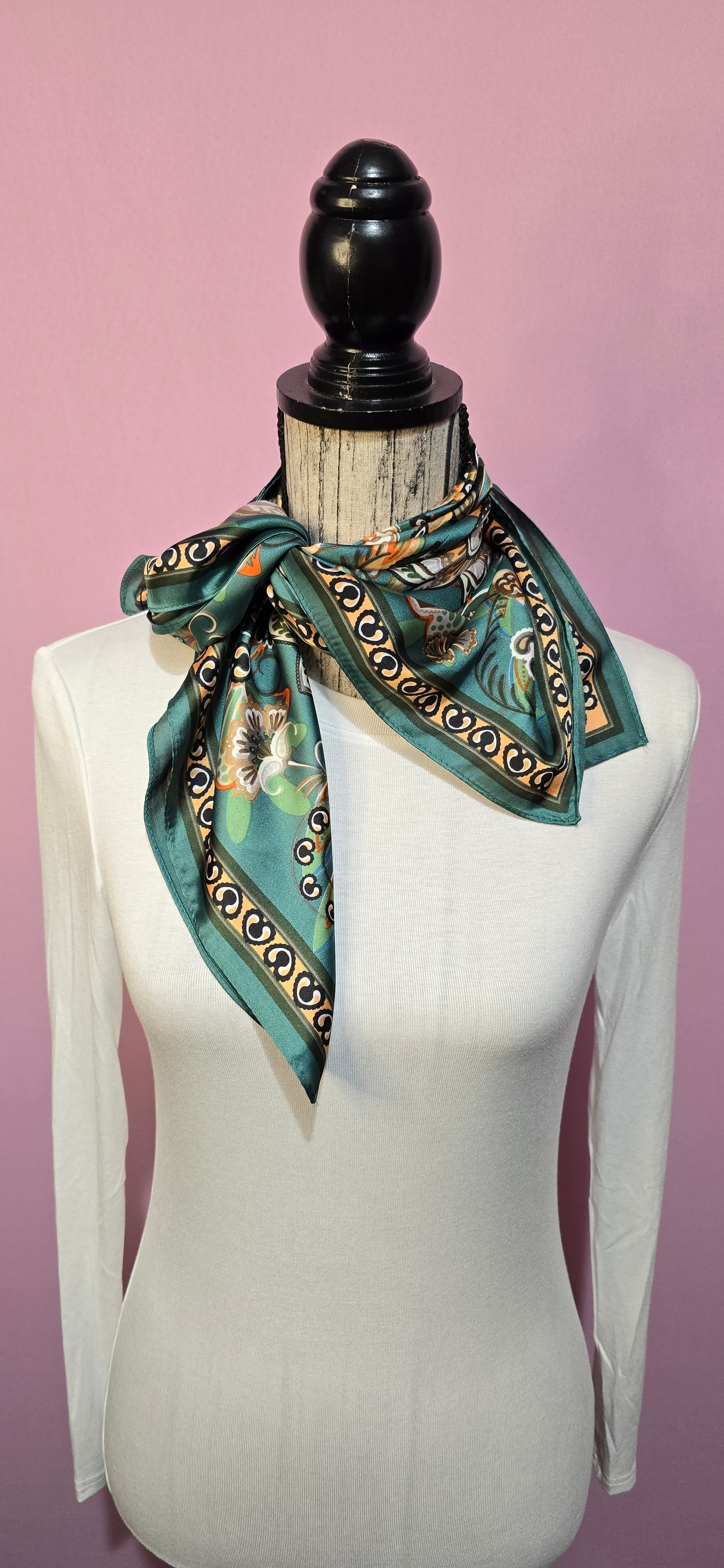 Elegante fazzoletto da collo in puro cashmere che unisce fantasie naturali e disegni raffinati su una base di colore petrolio. Morbido e versatile, perfetto per aggiungere un tocco di sofisticazione a qualsiasi outfit. Ideale da indossare al collo o come accessorio per completare il vostro stile con eleganza e comfort.