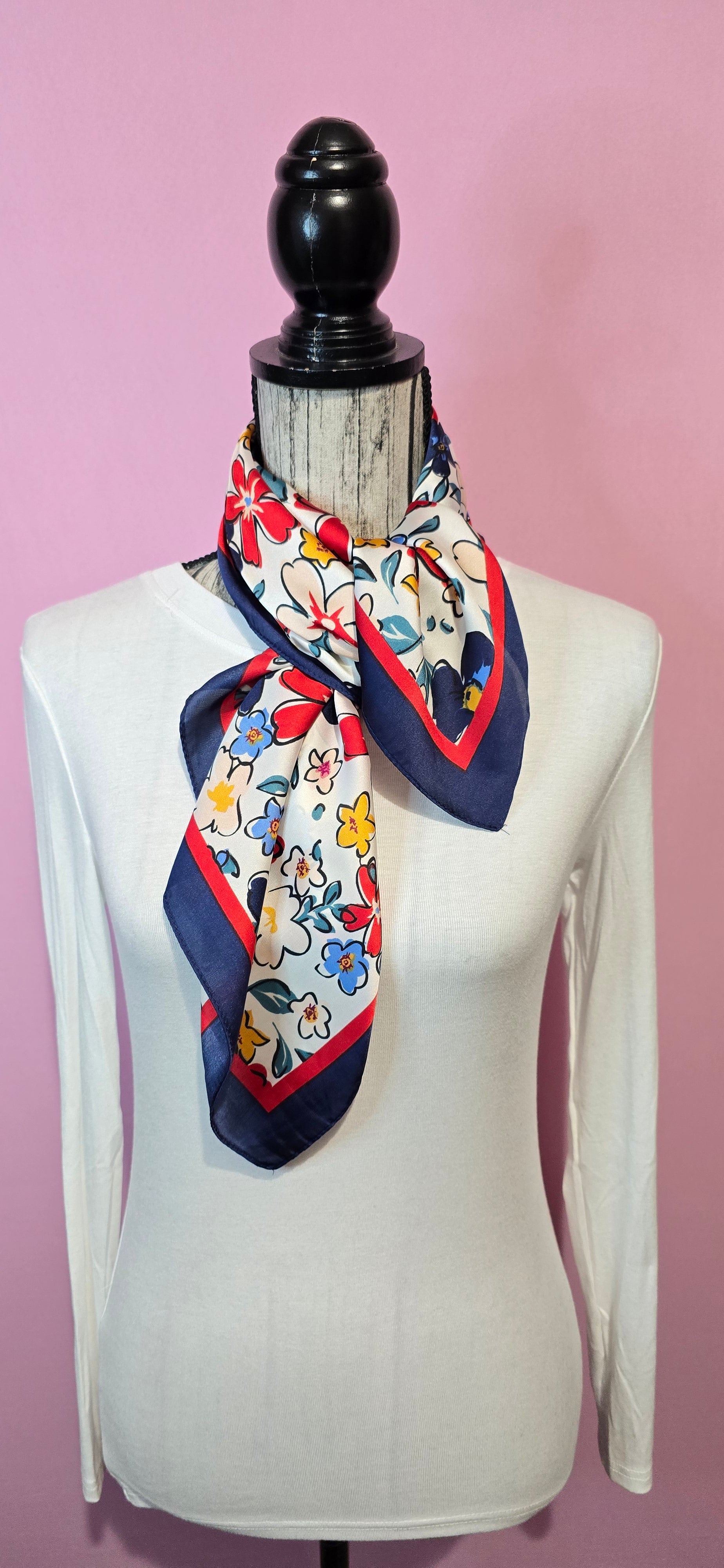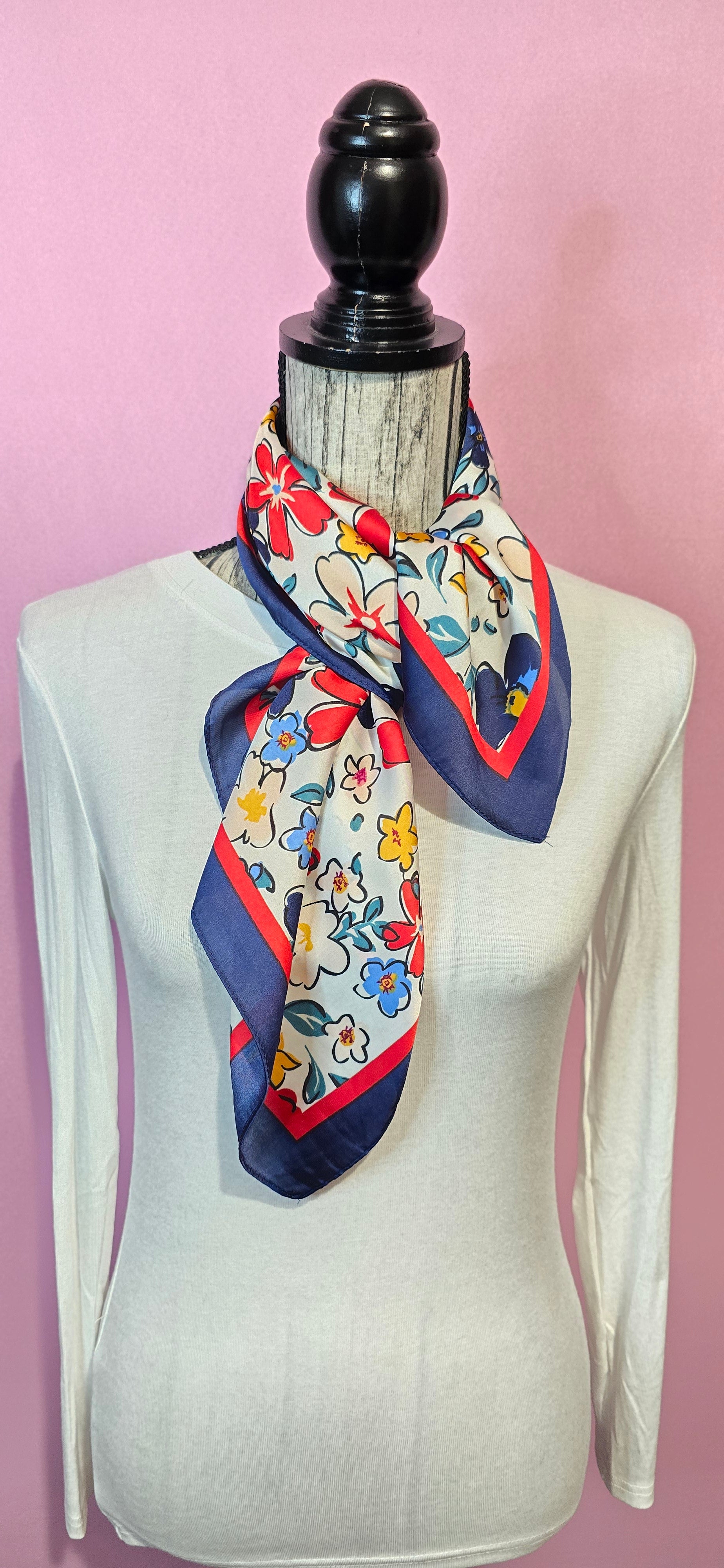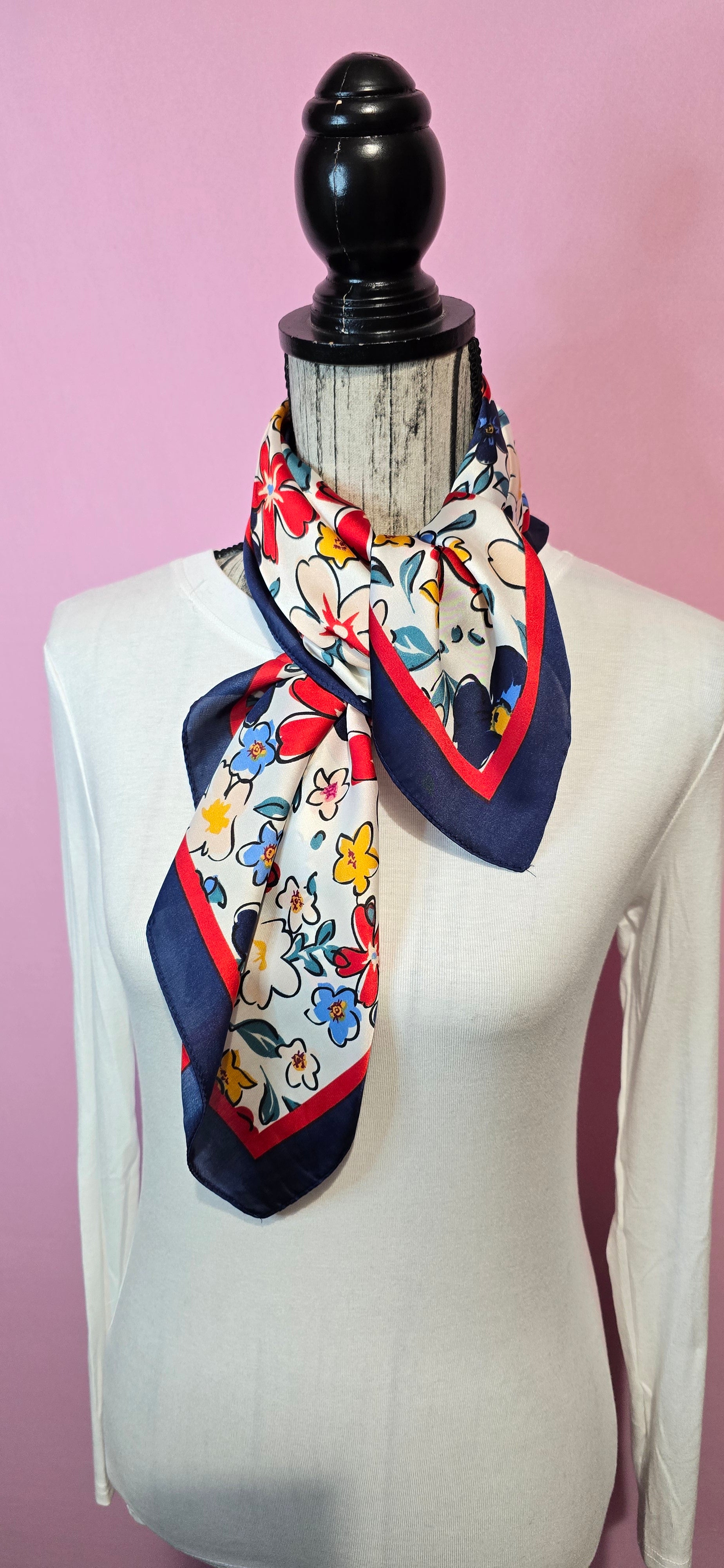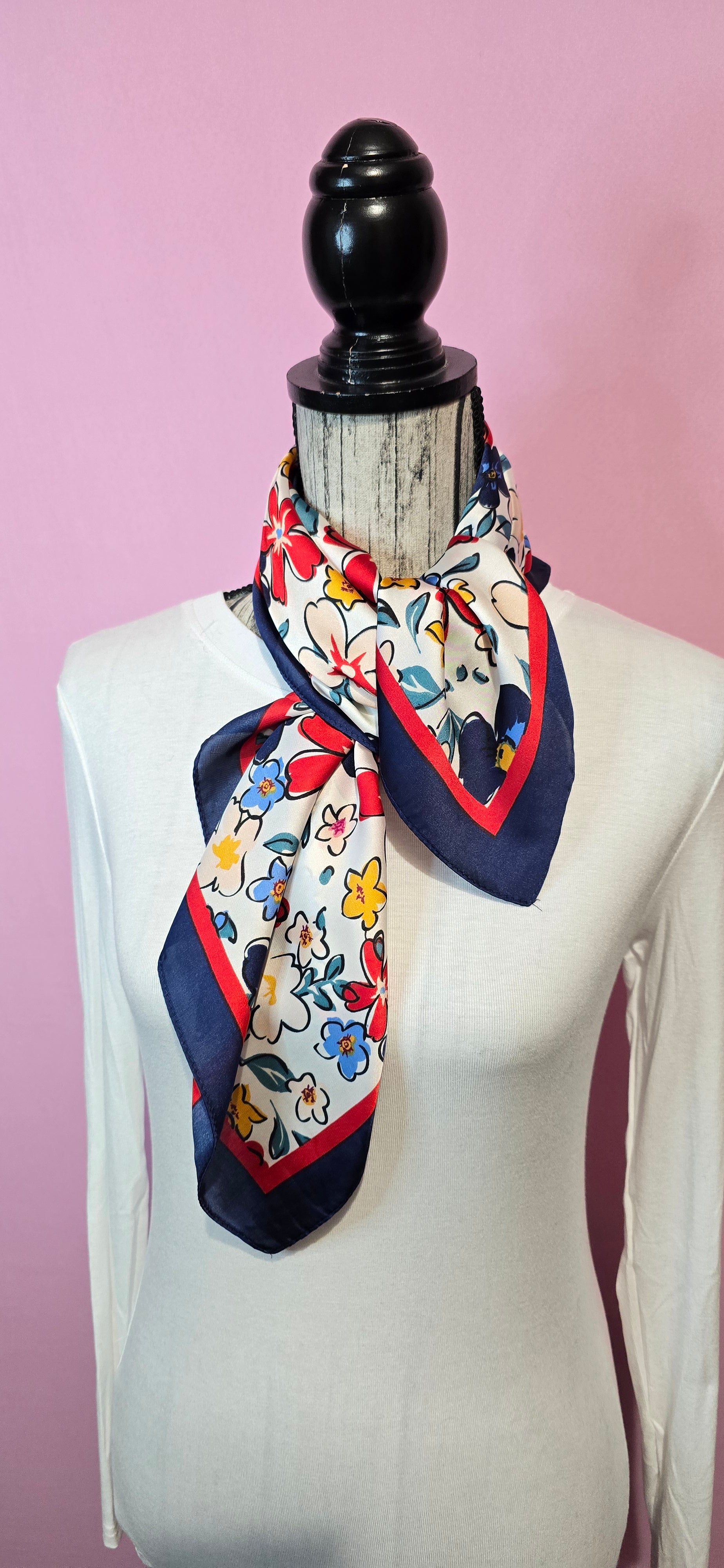 Fazzoletto da collo in tessuto pregiato con un delicato motivo floreale che combina tonalità di ocra, rosso e azzurro. Impreziosito da un elegante bordo blu royal che ne definisce i contorni con stile. Perfetto per aggiungere un tocco di raffinatezza al tuo look, sia con abiti casual che più formali. Un accessorio versatile e senza tempo che valorizza qualsiasi outfit.