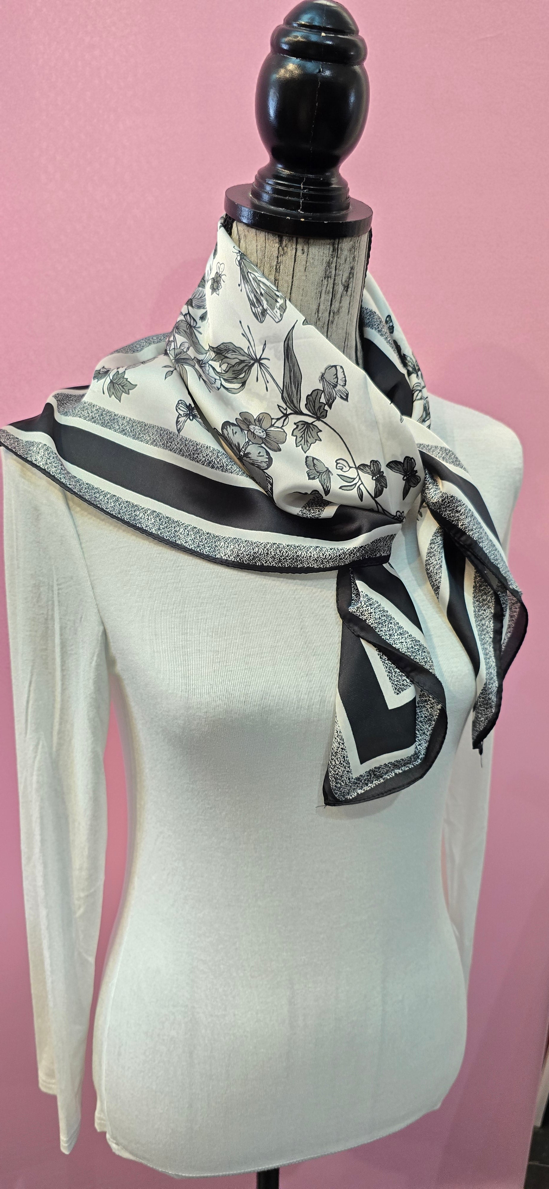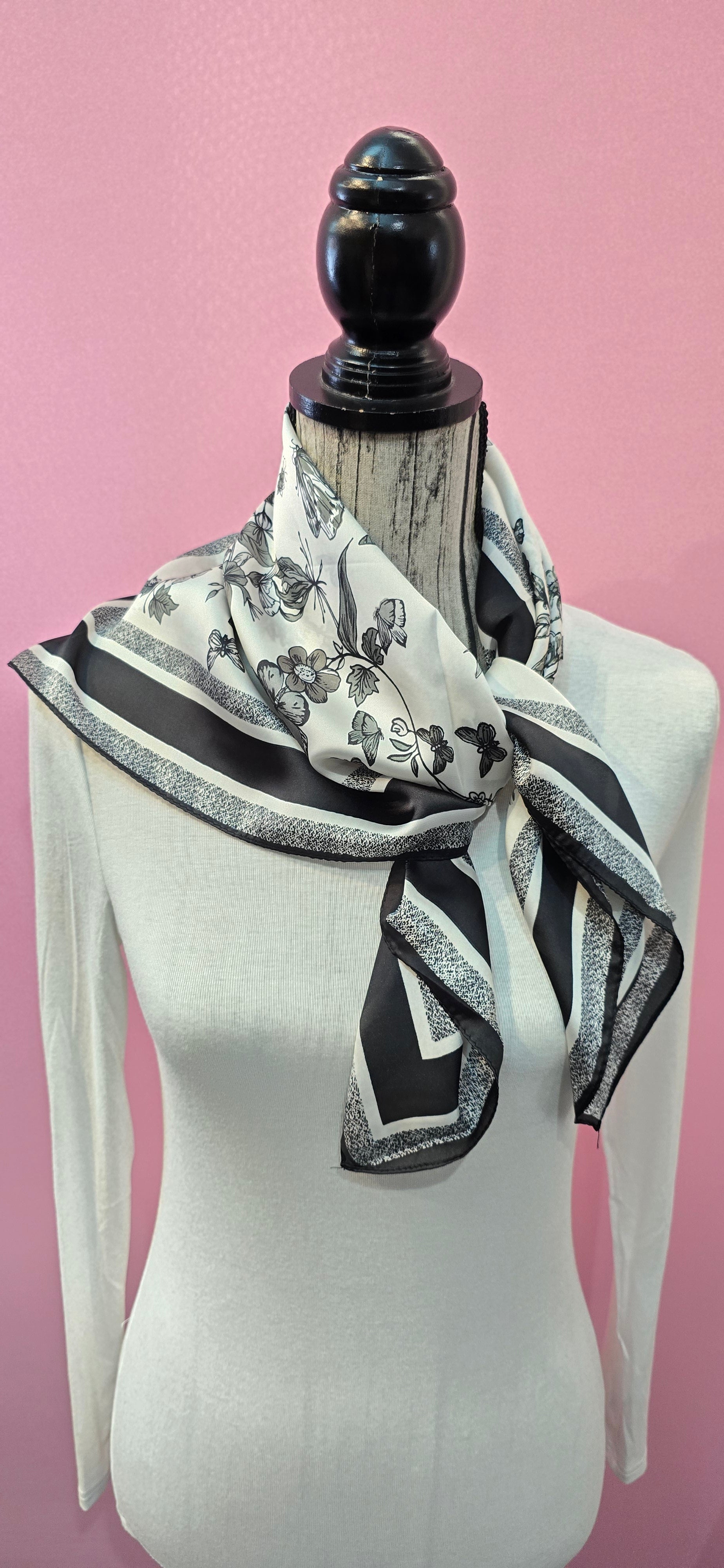 Elegante fazzoletto da collo con un affascinante motivo farfalle in tonalità bianche e nere. Un accessorio versatile che aggiunge un tocco di sofisticatezza a qualsiasi outfit, perfetto per chi ama i dettagli raffinati. Ideale da indossare al collo, come fascia per i capelli o come elemento decorativo su una borsa. Un pezzo senza tempo che combina stile classico e fantasia delicata.