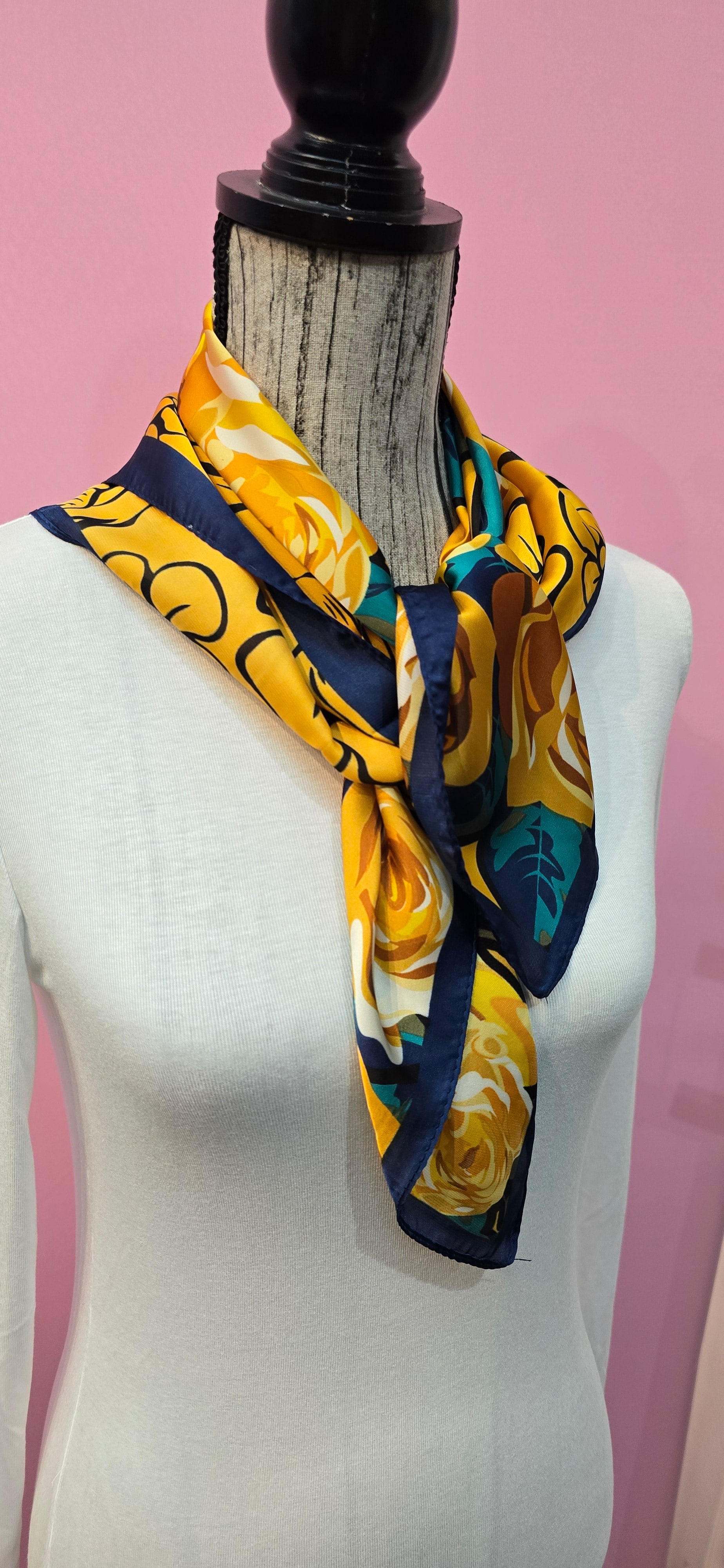 Elegante fazzoletto da collo che cattura l'essenza della primavera con un delicato motivo floreale di rose sbocciate. La base in tonalità ocra crea un'armonia calda e sofisticata, mentre il bordo blu e petrolio aggiunge un tocco di profondità e carattere. Perfetto per elevare qualsiasi outfit con un dettaglio raffinato e versatile. Un accessorio senza tempo che combina stile classico e contemporaneo.
