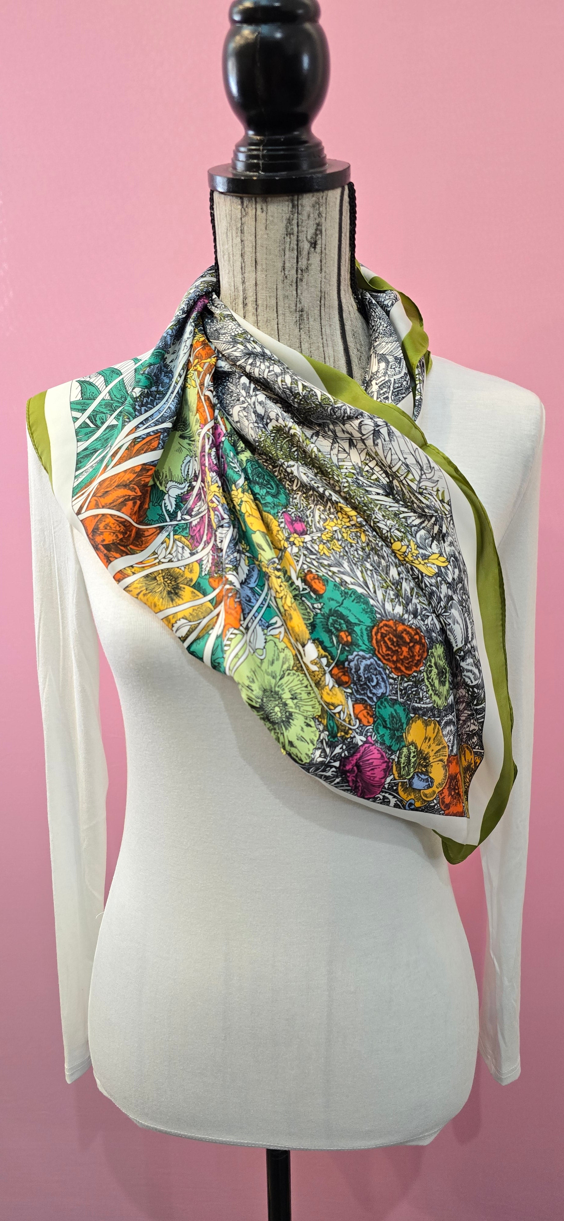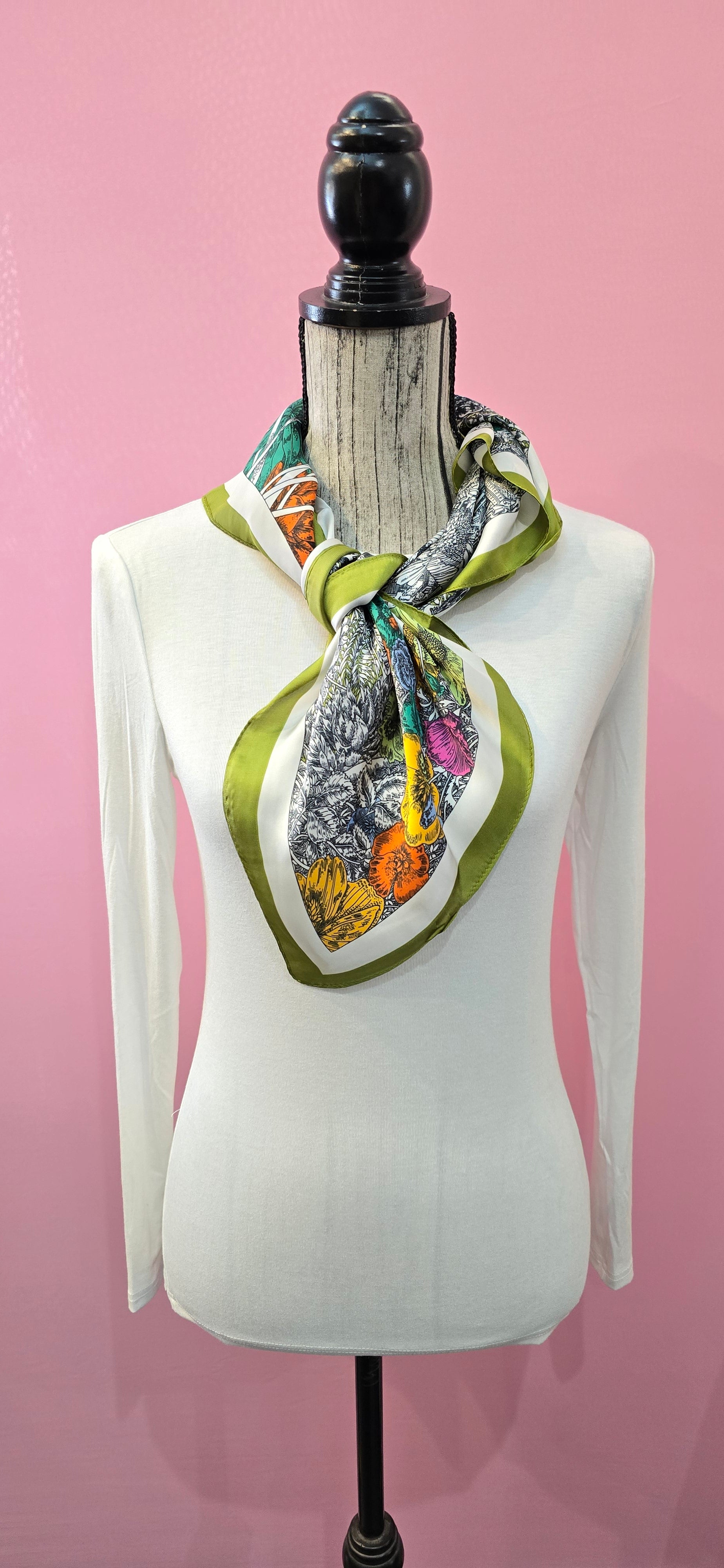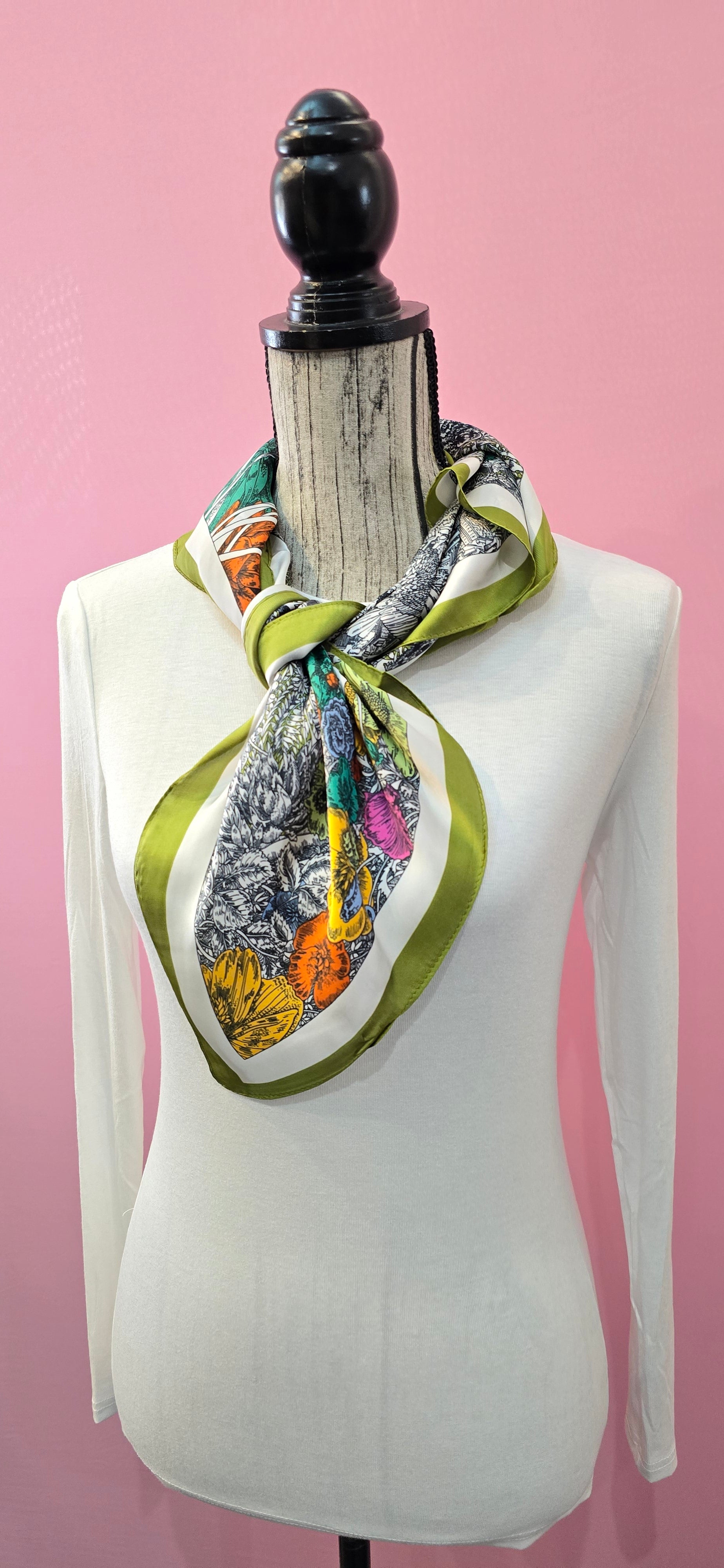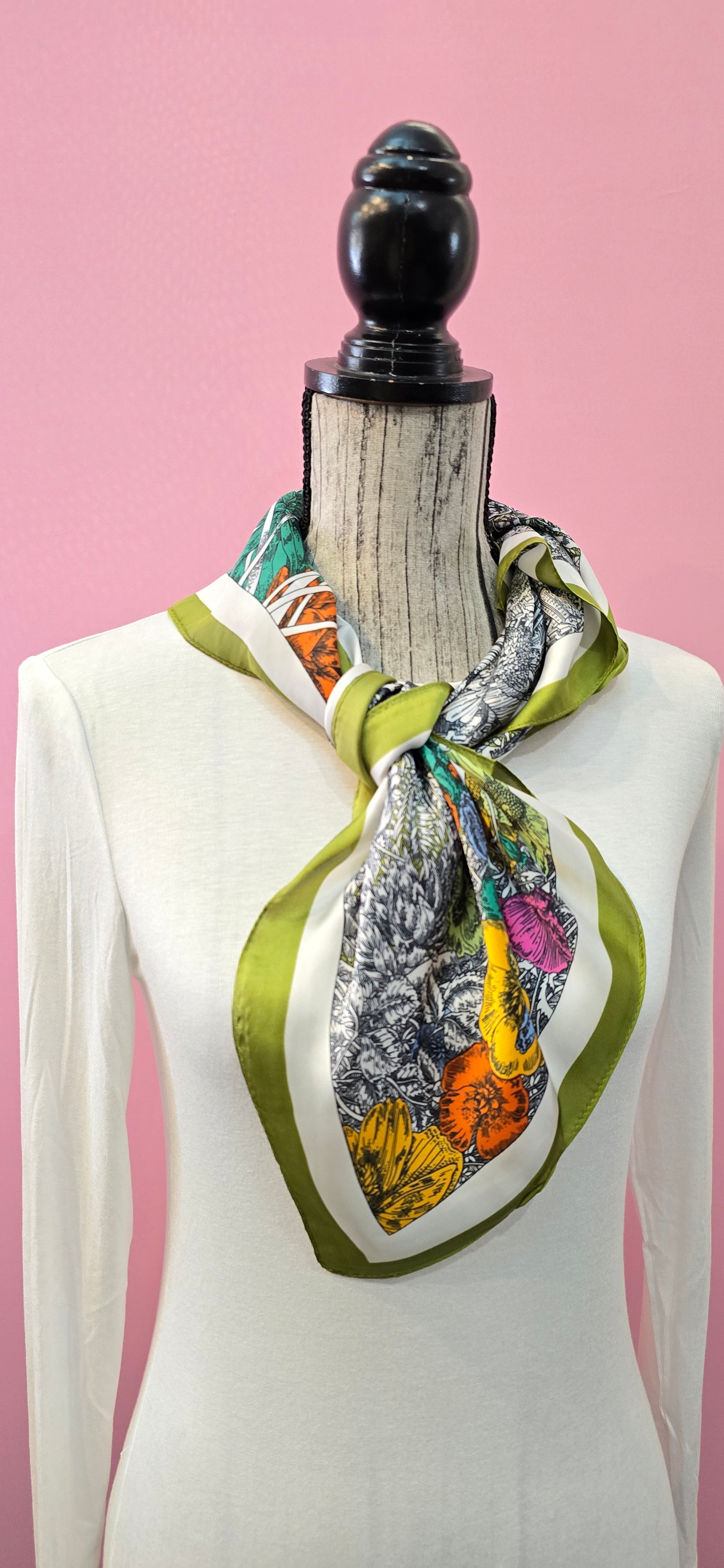 Fazzoletto da collo in cotone pregiato con bordo verde acido che incornicia una delicata stampa floreale su fondo bianco. Un accessorio versatile e raffinato, perfetto per aggiungere un tocco di eleganza a qualsiasi outfit. Indossalo al collo, annodalo ai capelli o personalizza la tua borsa: le possibilità sono infinite. Ideale per chi ama i dettagli che fanno la differenza.