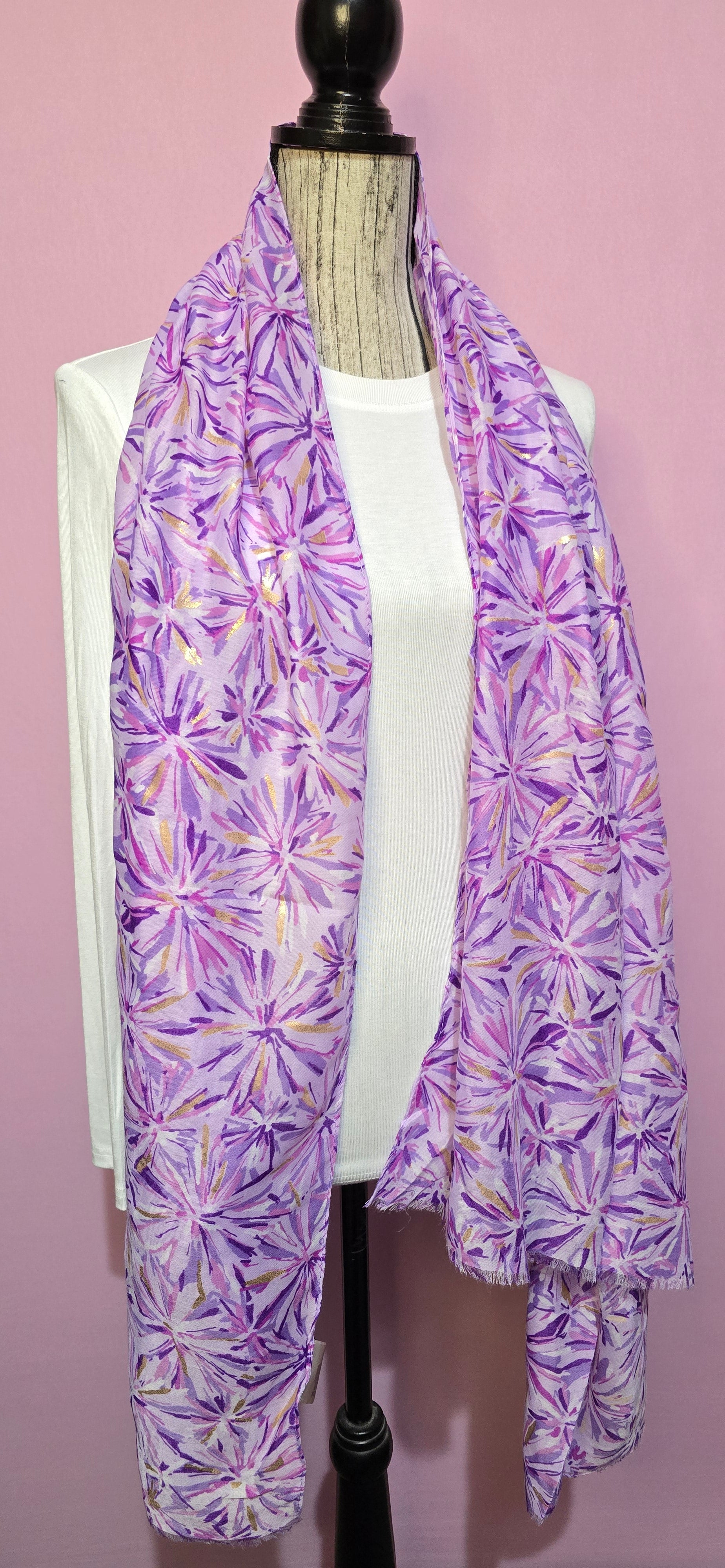 Foulard Violetta è un accessorio sofisticato che unisce eleganza e modernità. Realizzato in viola intenso, presenta affascinanti motivi geometrici impreziositi da una delicata laminatura oro che cattura la luce con ogni movimento. Perfetto per aggiungere un tocco di raffinatezza a qualsiasi outfit, questo foulard si distingue per i suoi dettagli ricercati e il contrasto affascinante tra il colore profondo e gli accenti dorati. Un pezzo versatile che trasforma sia look casual che formali con stile e personalità.