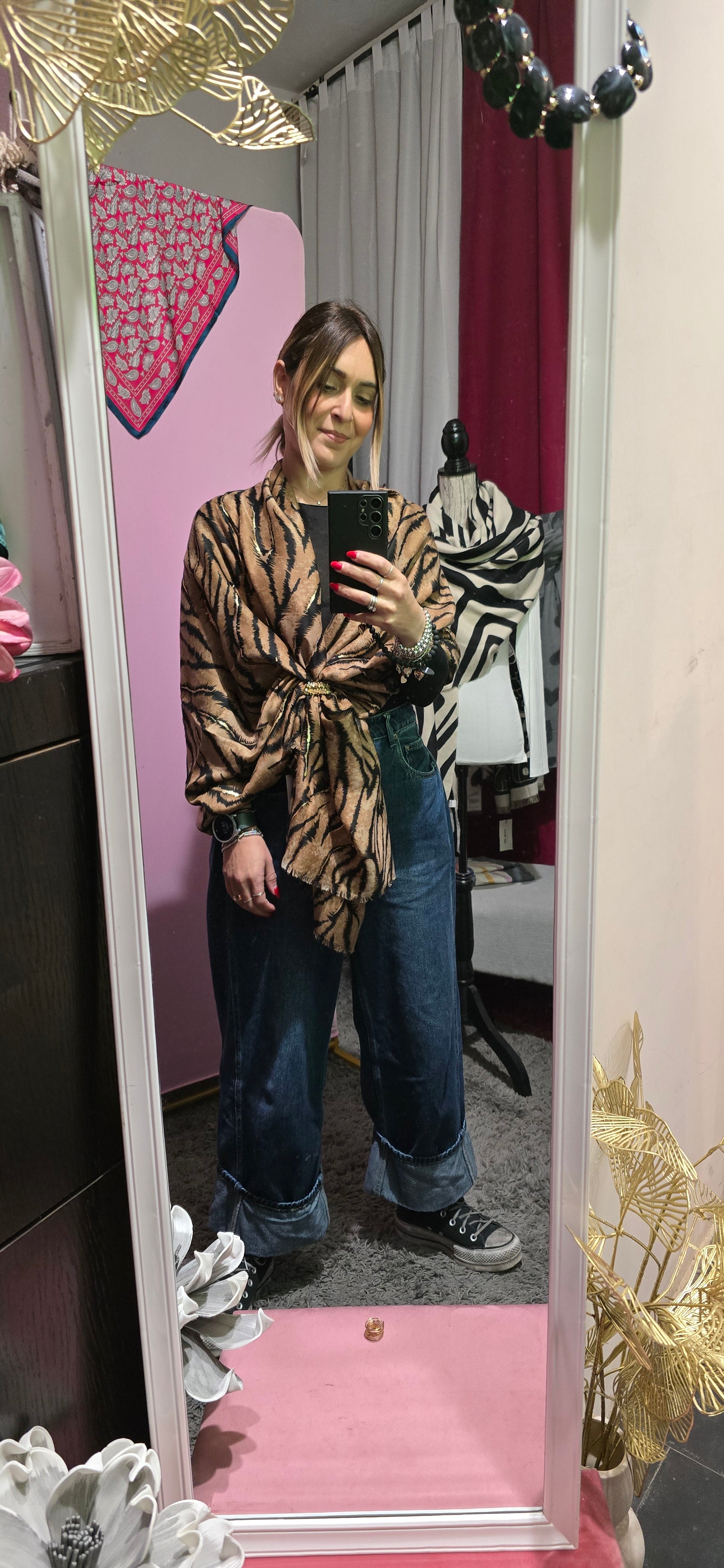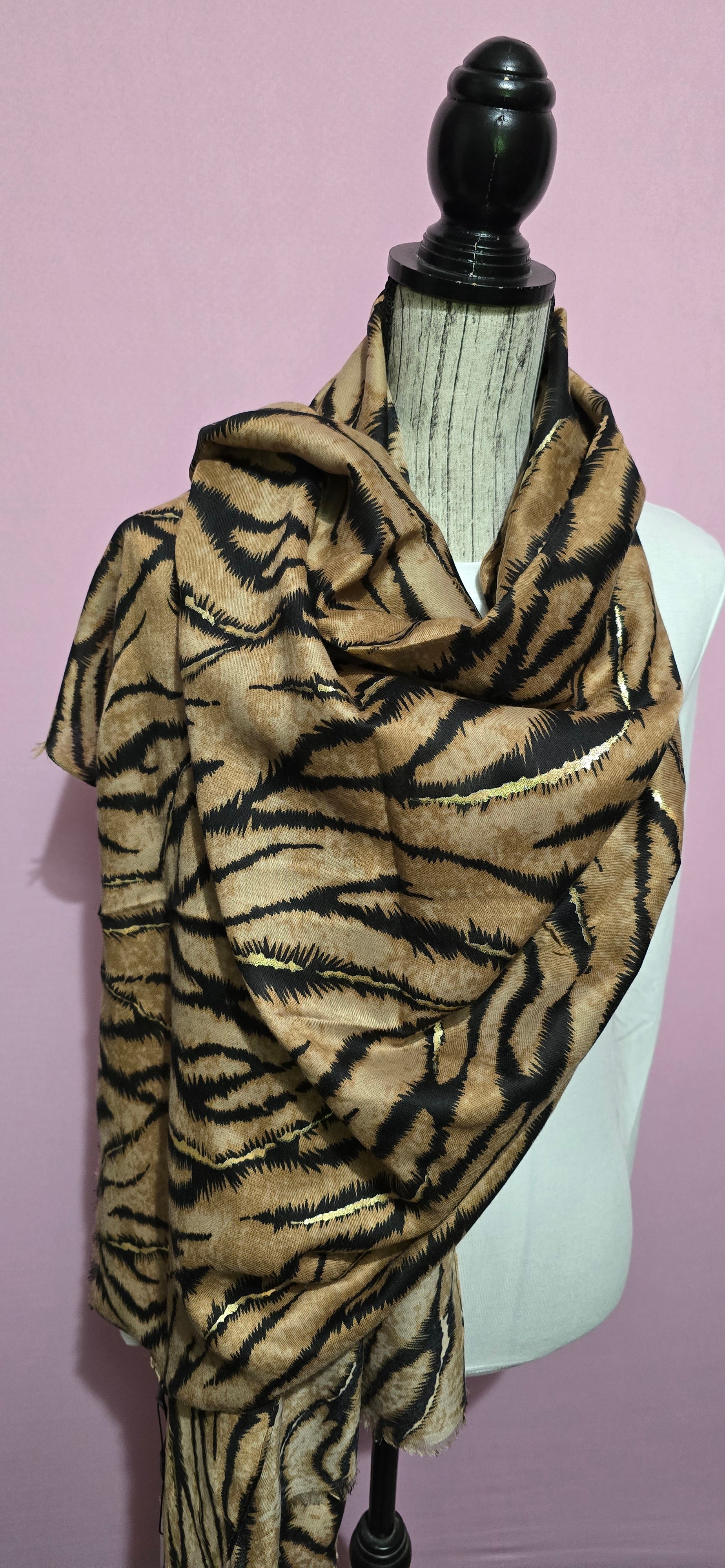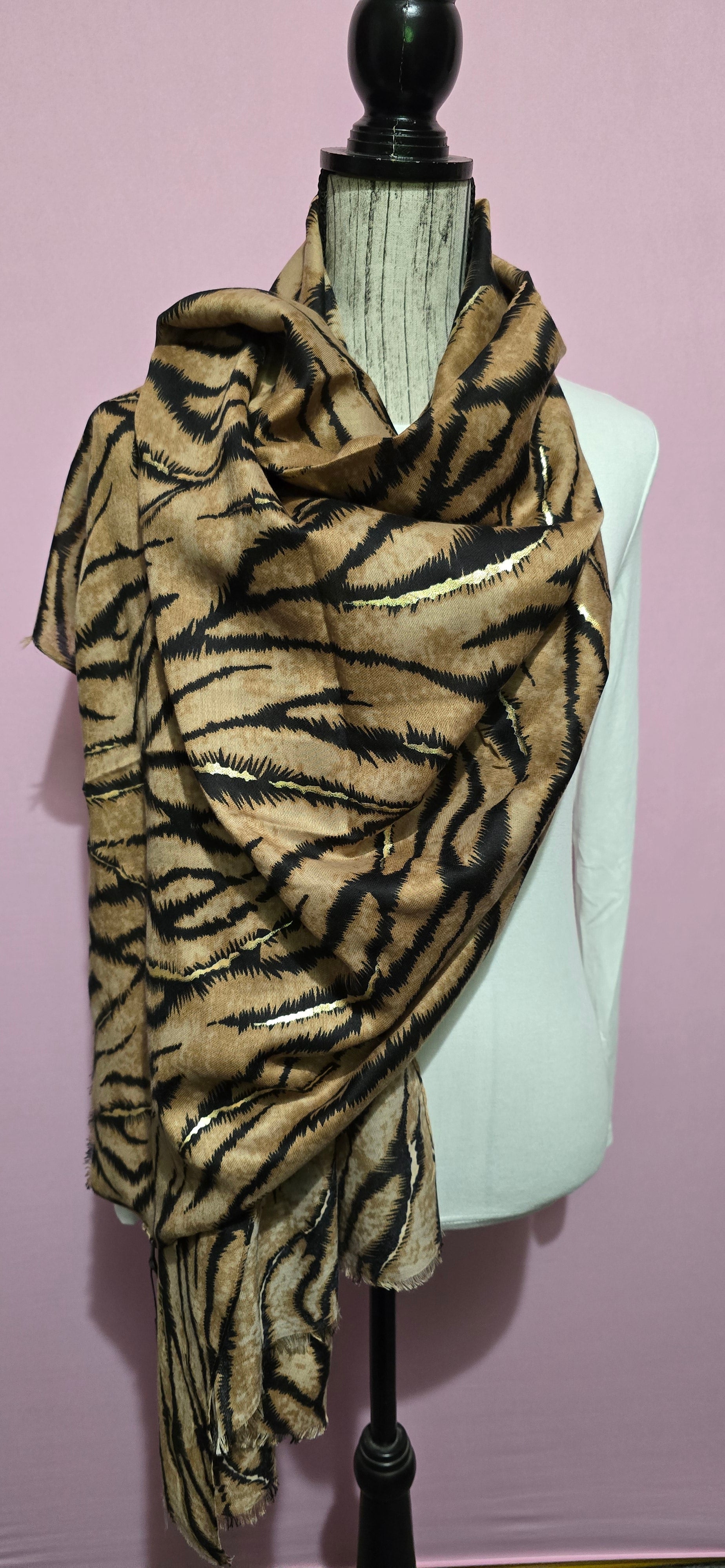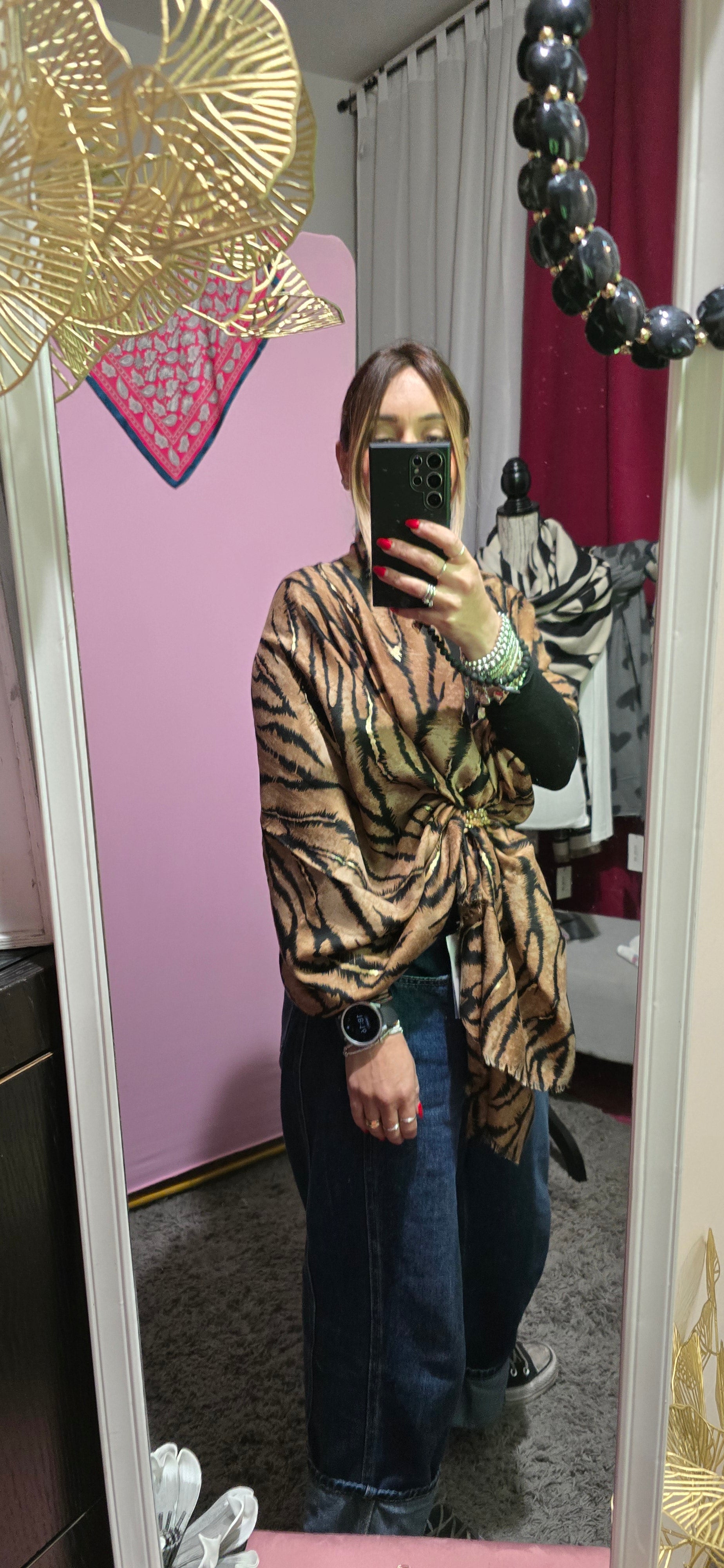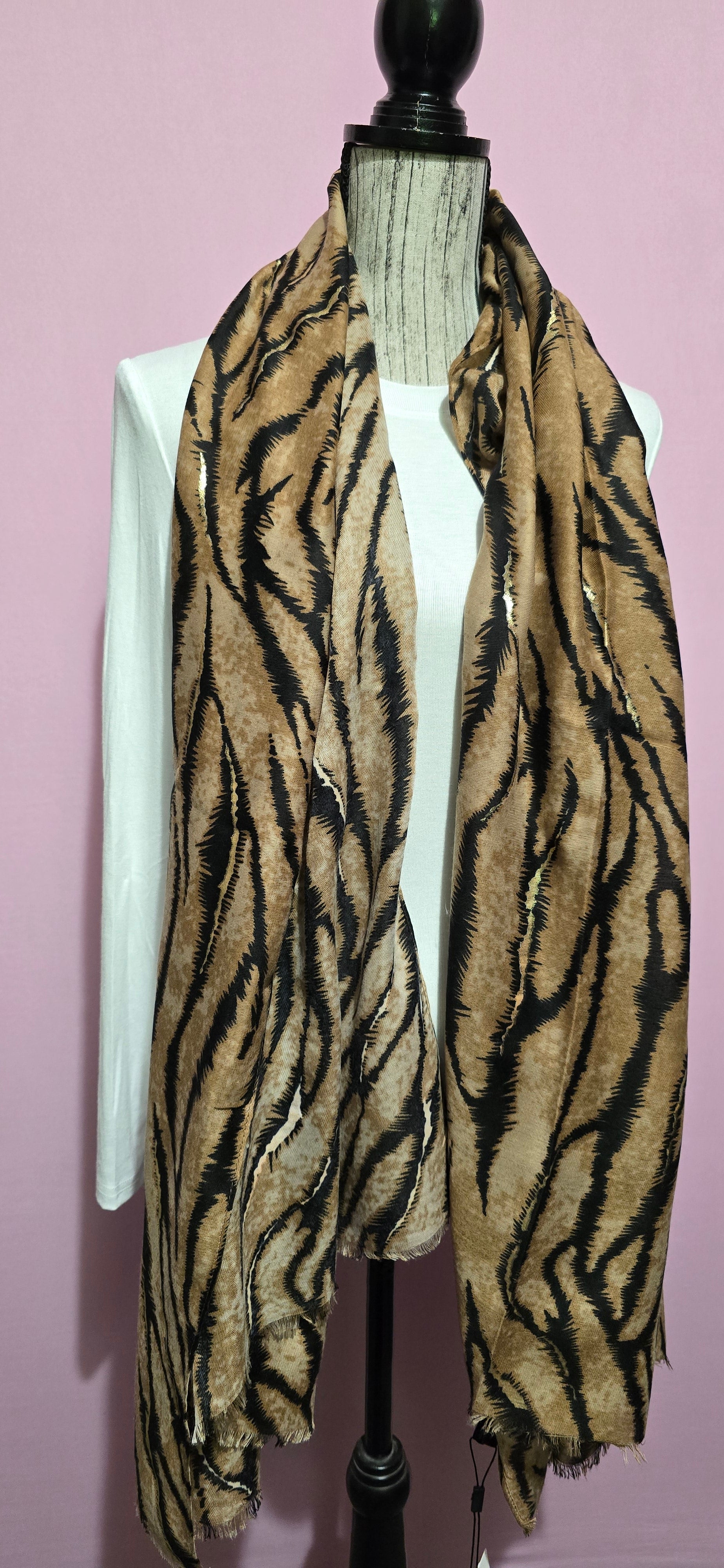 Stola in morbido tessuto con affascinante stampa animalier nei toni del tabacco. Un capo versatile e sofisticato che si adatta perfettamente a look casual e più eleganti. La texture fluida garantisce comfort durante tutto il giorno, mentre il pattern deciso aggiunge carattere e personalità al tuo outfit. Ideale per chi ama i dettagli naturali e le tonalità calde.