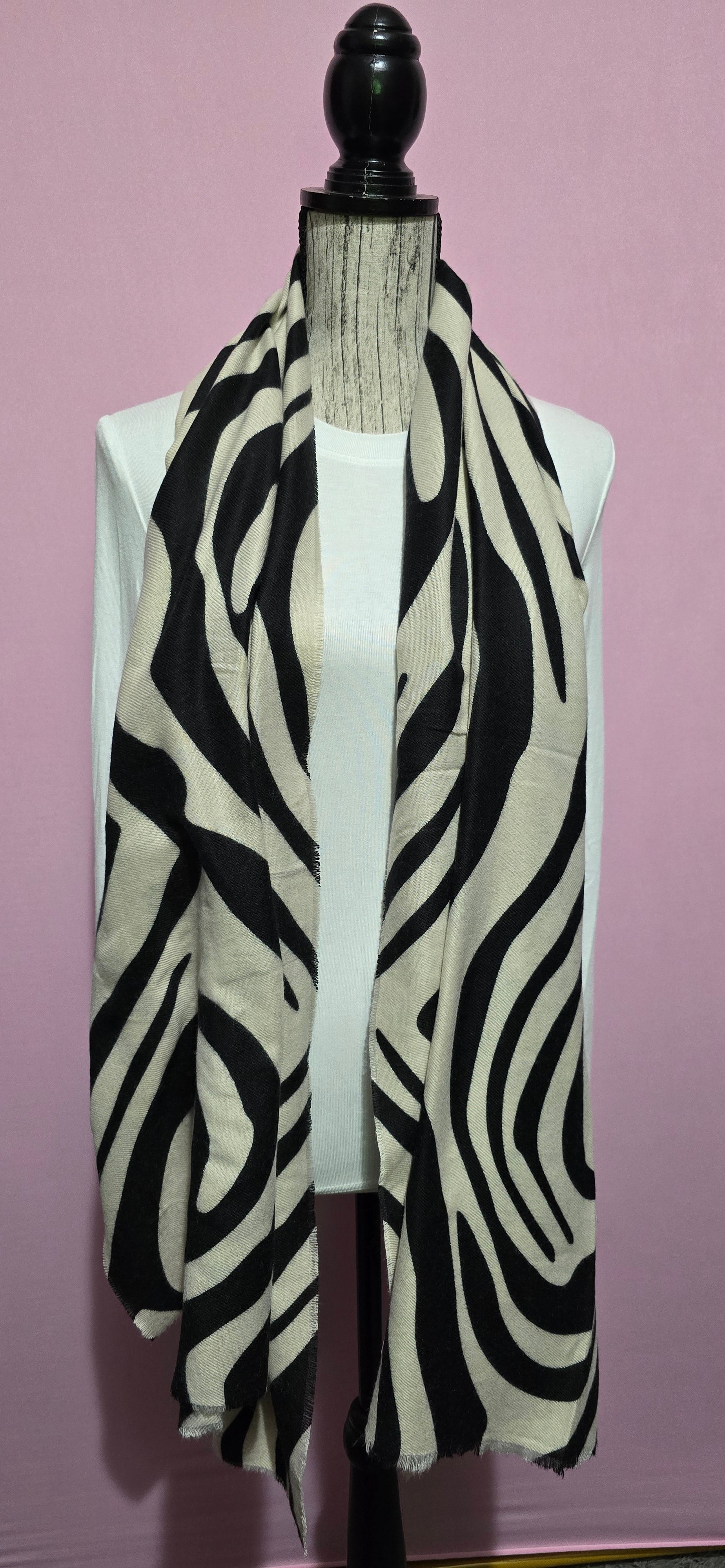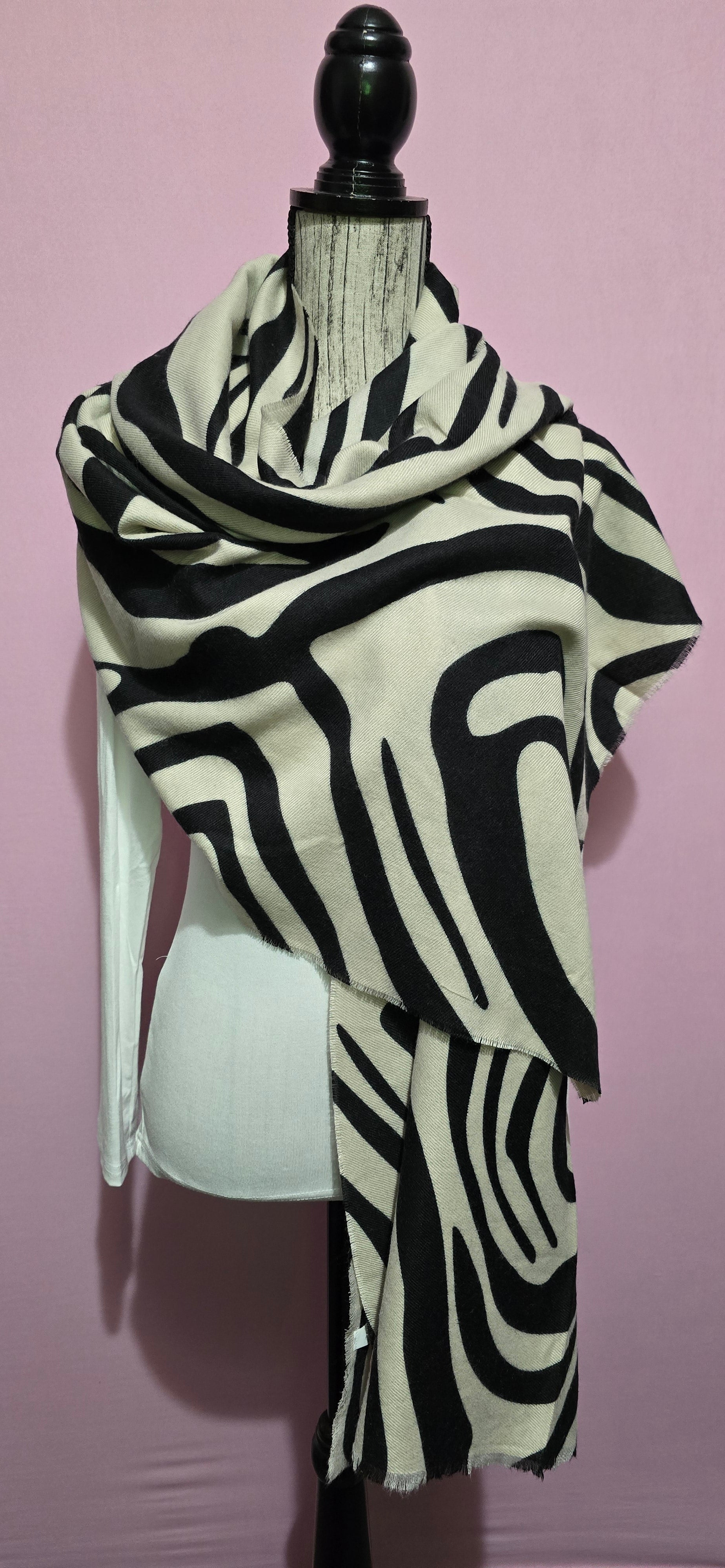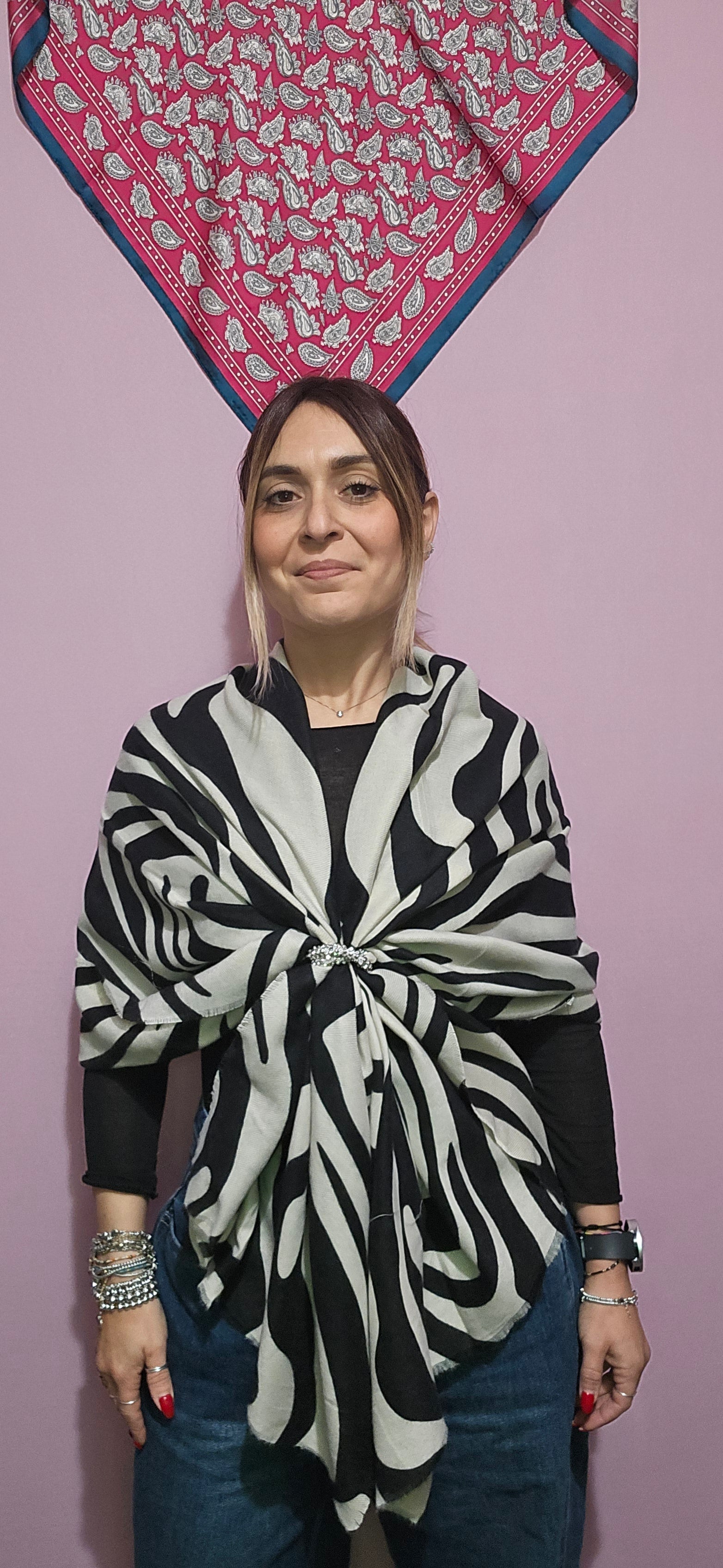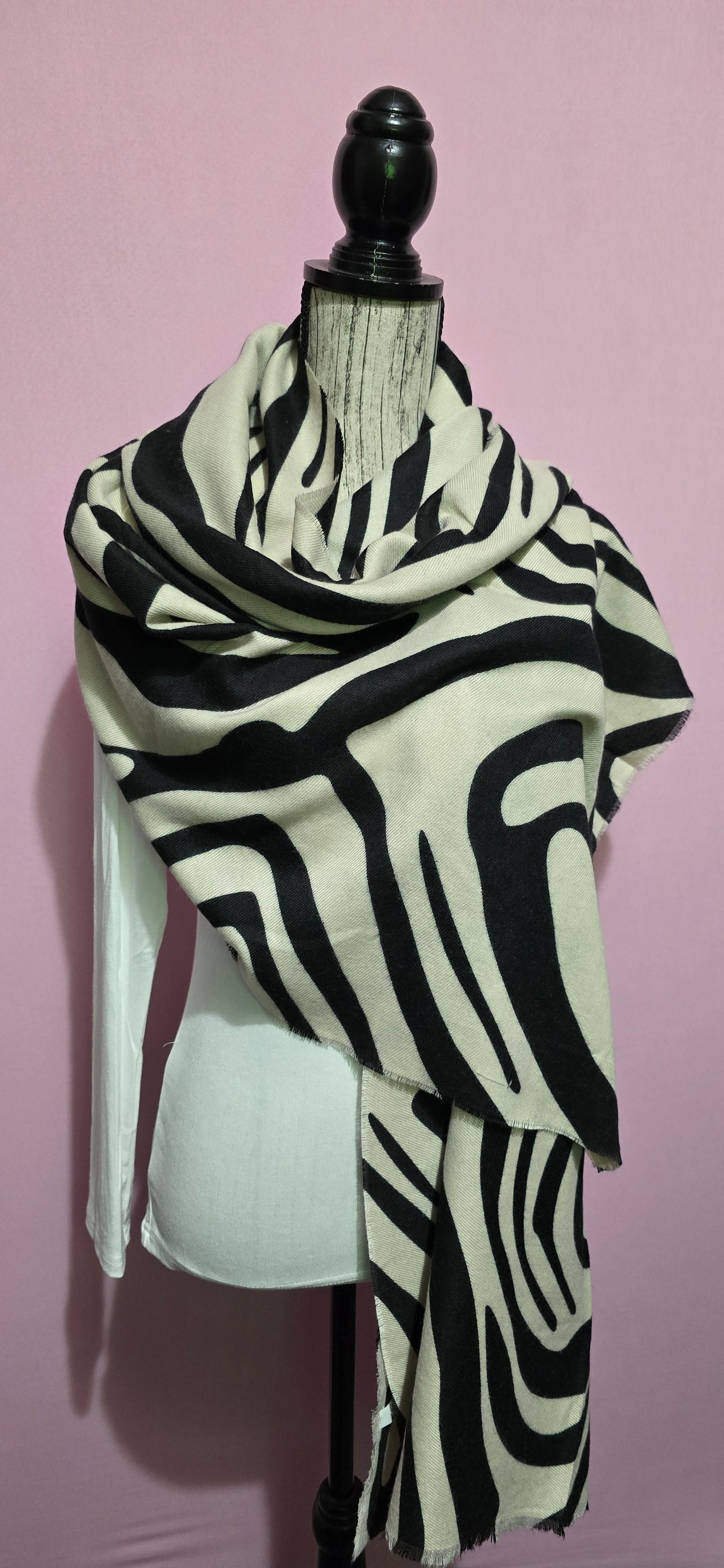Stola elegante con motivo zebrato in bianco e nero, perfetta per aggiungere un tocco di stile sofisticato a qualsiasi outfit. Il design a righe crea un effetto visivo affascinante che si adatta facilmente a look casual o più formali. Realizzata con attenzione ai dettagli, questa stola è l'accessorio ideale per chi ama osare con stampe caratteristiche mantenendo un'eleganza senza tempo.